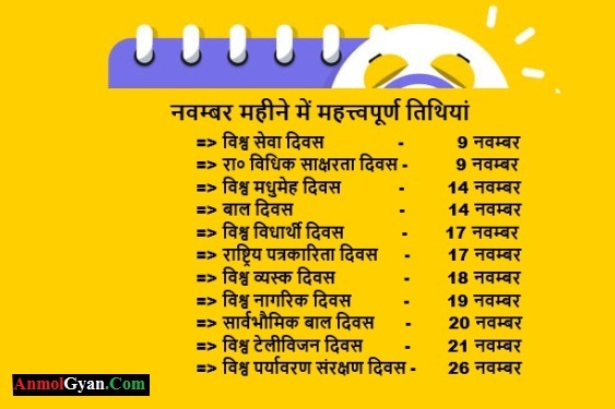 Important Dates in the Month of November – नवम्बर महीने में महत्त्वपूर्ण तिथियां